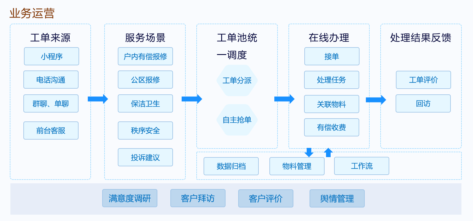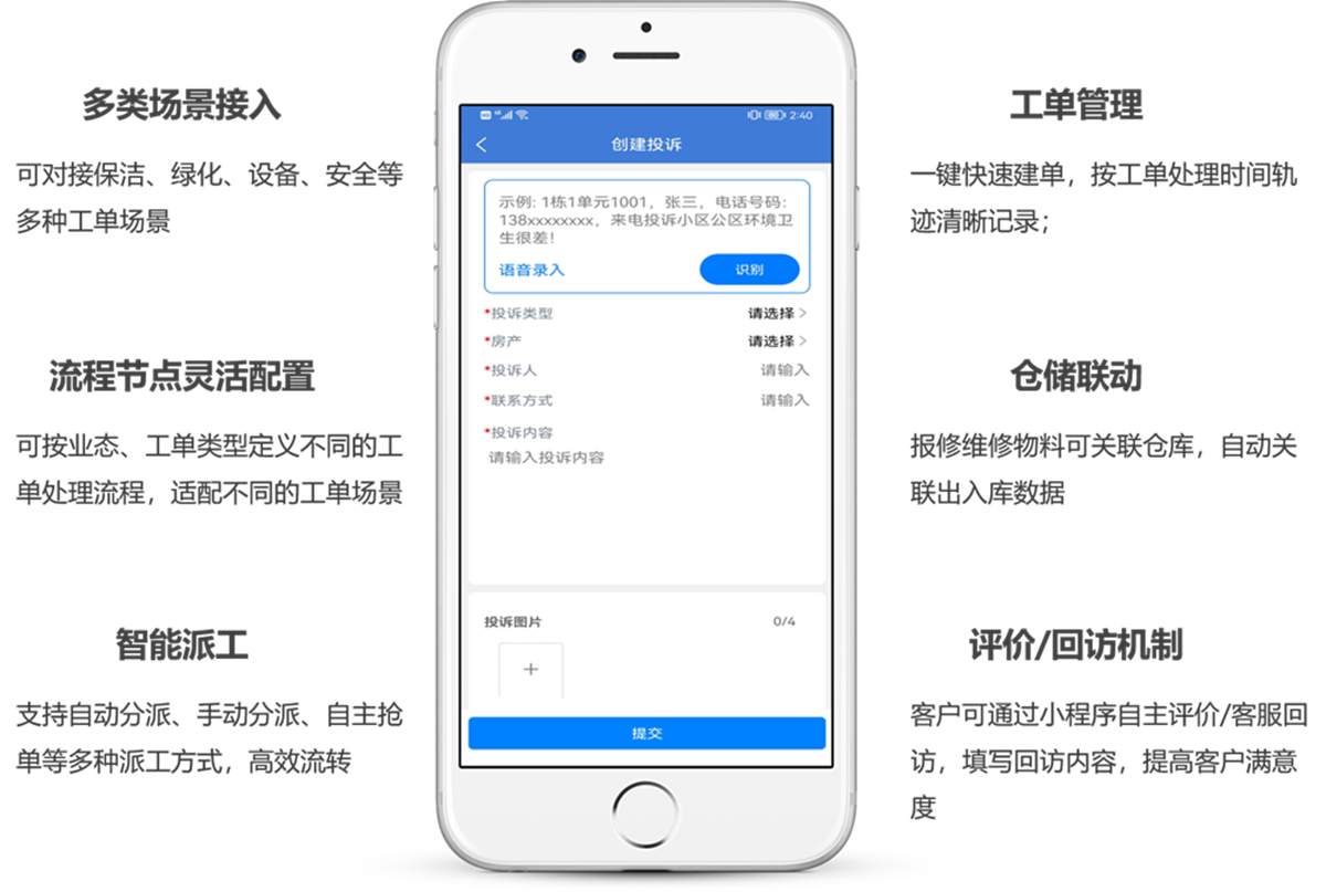 智能客户服务产品,通过数智化手段,支持诉求问题一键发起报事报修工单和投诉工单,通过线下沟通、电话反馈、小程序等多渠道触点,集中管控客户诉求。借助高度灵活的流程节点,可无缝流转跨部门协作沟通,有效跟踪、干预、闭环客户诉求,提高服务响应效率及满意度。同时集满意度调研、拜访、客户评价等为一体,不断提升服务品质。