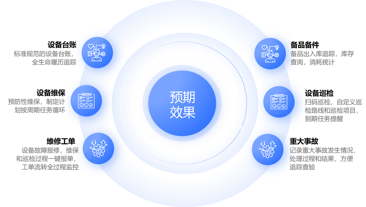 建⽴完整的设备档案,实现一物一码,全流程覆盖设备巡检、维护保养、故障维修、报废停用等全生命周期管理,保障设备安全和稳定运行,帮助企业实现设备的规范化、智能化管理,降低设备故障率,保持设备稳定性。