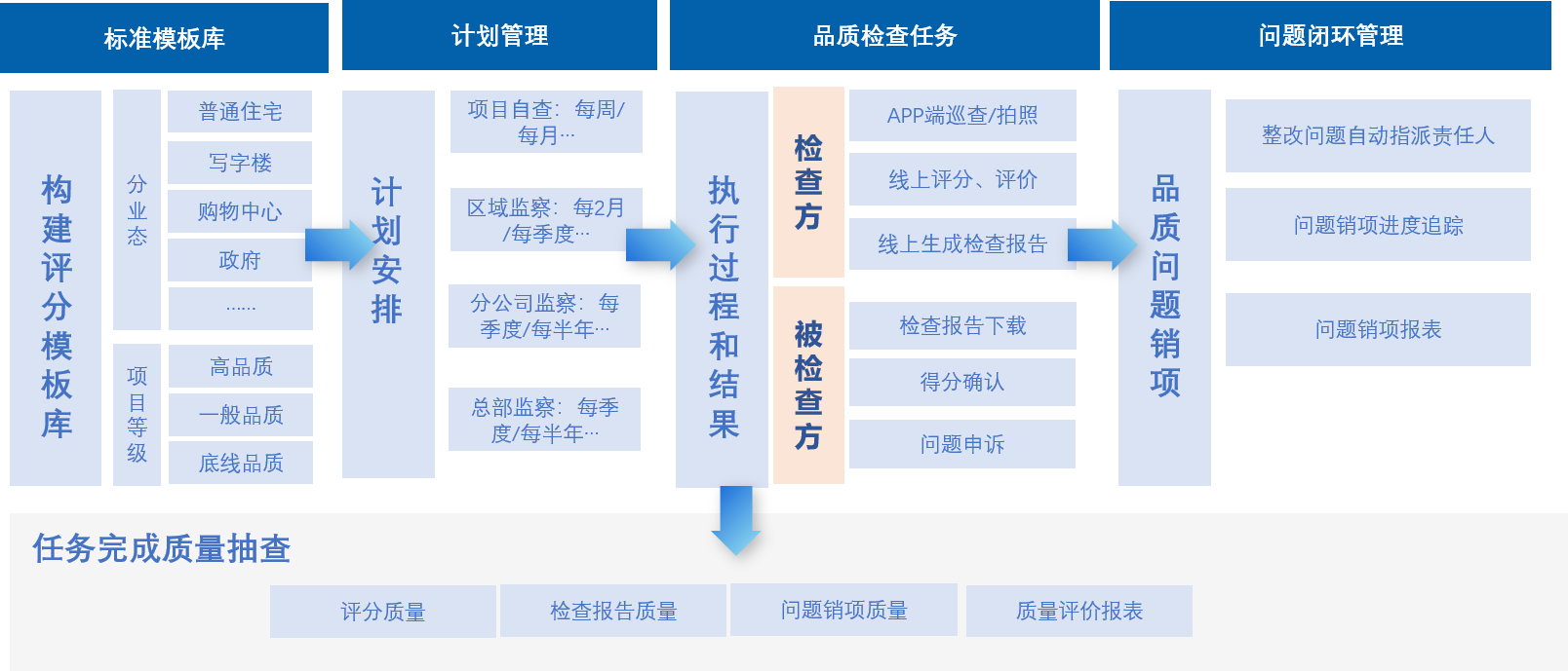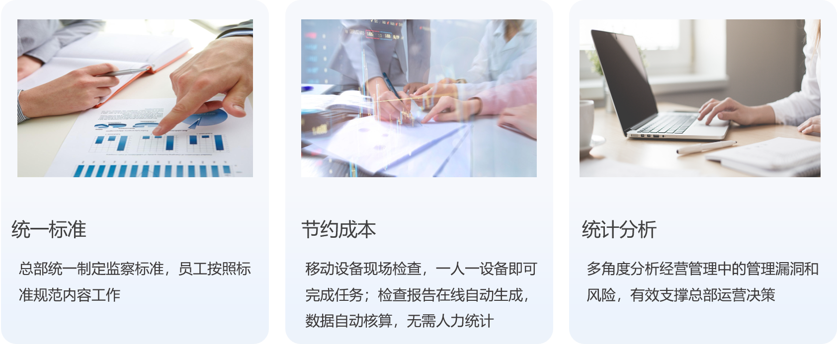 根据总部/集团管理要求制定品质监查、品质自查计划,并依据计划自动生成检查、自查任务,推送给相应的业务主管、项目经理来核查,确保员工(或外包人员)品质达成情况(服务过程、服务结果合规等),提高现场服务品质。同时支持上级在线监管业主主管、项目经理工作结果,定期抽查核查结果,再次保证监督监察到位。有效降低品质核查成本,提升督导效率。